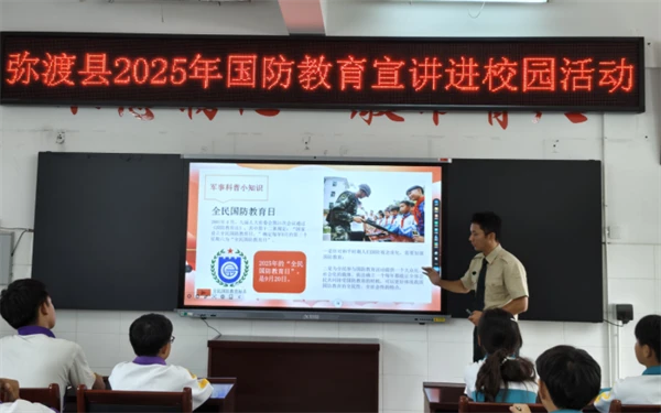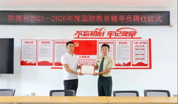 为认真贯彻落实《中华人民共和国国防教育法》,进一步普及和加强国防教育,弘扬爱国主义精神,增强在校学生国防情怀。近日,大理州弥渡县国动办、共青团弥渡县委联合县委宣传部、县退役军人事务局举行国防教育辅导员聘任仪式,为具备丰富国防教育经验的退役军人李升阳获颁聘书,切实充实弥渡县国防教育宣传力量。李升阳作为主讲老师,先后赴寅街中学和红岩中学,共面向160余名学生开展别开生面的国防教育主题宣讲活动。
